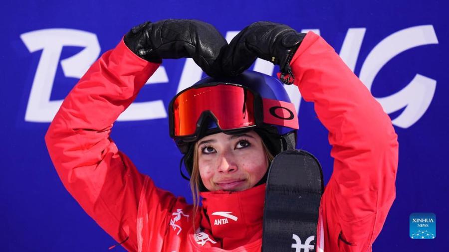 Gu Ailing of China reacts during the freestyle skiing women's freeski slopestyle final of Beijing 2022 Winter Olympics at Genting Snow Park in Zhangjiakou, north China's Hebei Province, Feb. 15, 2022. (Xinhua/Xu Chang)
