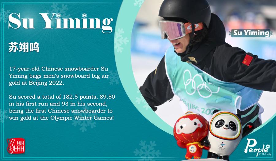 17-year-old Chinese snowboarder Su Yiming bags men's snowboard big air gold at Beijing 2022. Su scored a total of 182.5 points, 89.50 in his first run and 93 in his second, being the first Chinese snowboarder to win gold at the Olympic Winter Games!