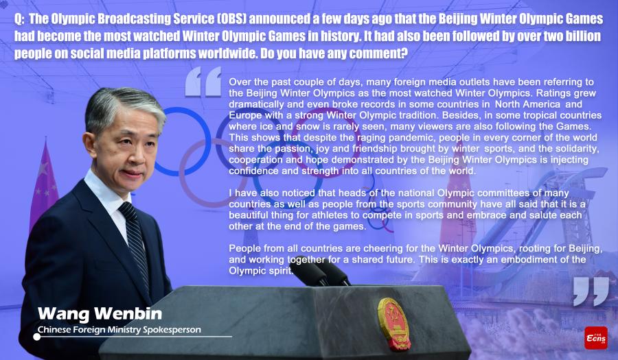 Global cheers for Beijing Olympics 'full embodiment of Olympic spirit': FM spokesperson