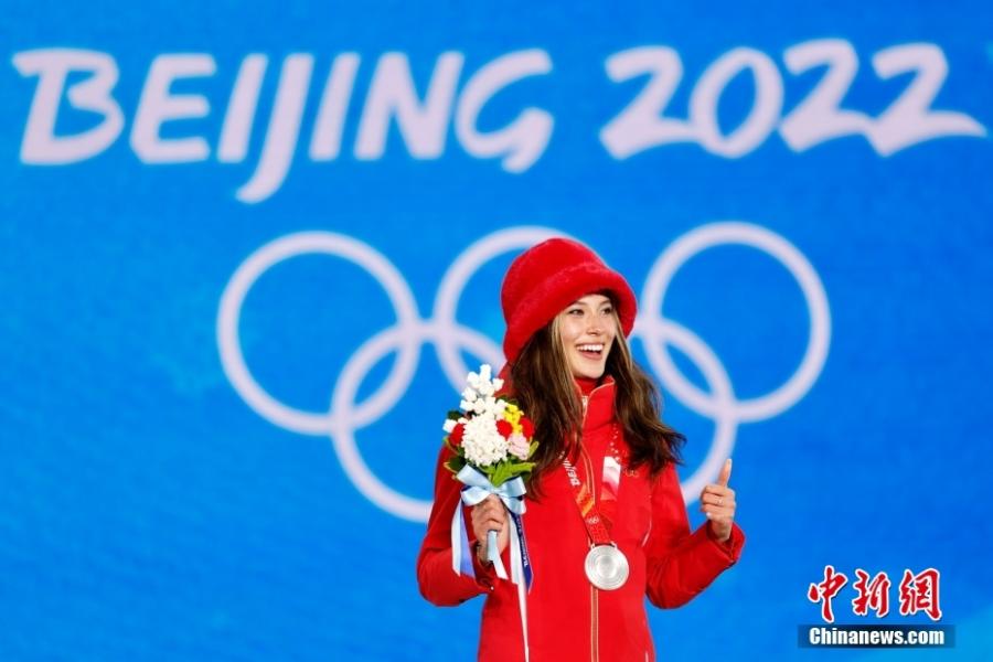 Silver medalist Gu Ailing of China poses for photos during the awarding ceremony of freestyle skiing women's freeski slopestyle at Zhangjiakou Medals Plaza of the Winter Olympics in Zhangjiakou, north China's Hebei Province, Feb. 15, 2022. (Photo:China News Service/Fu Tian)