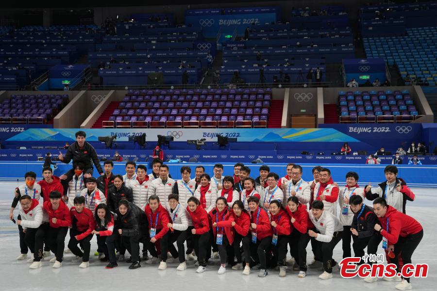 Chinese short track speed skating team poses for a group photo at the Capital Indoor Stadium after finishing competitions at the Beijing 2022 Winter Olympics in Beijing , capital of China, Feb. 16, 2022. (Photo: China News Service/Cui Nan)