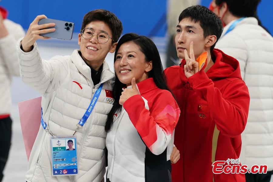 Fan Kexin (L), Yang Yang (C) and Wu Dajing take selfie at the Capital Indoor Stadium in Beijing , capital of China, Feb. 16, 2022. (Photo: China News Service/Cui Nan)