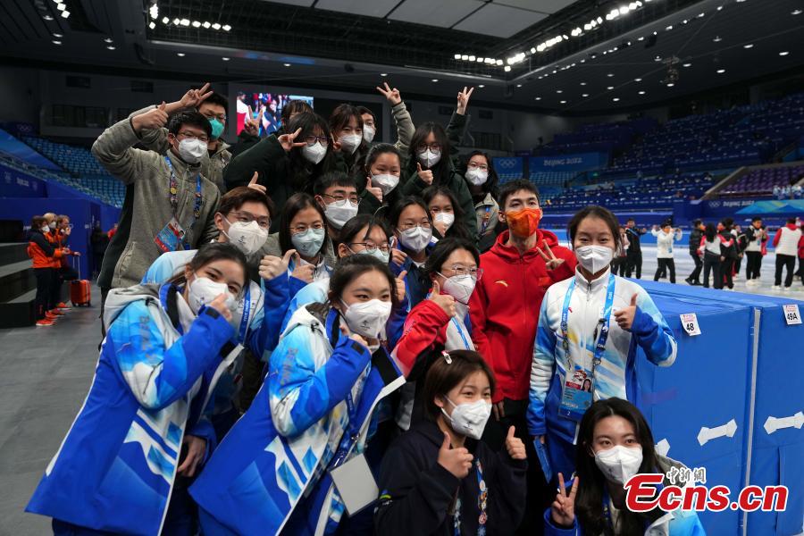 Wu Dajing (in red) poses for photos with volunteers at the Capital Indoor Stadium in Beijing , capital of China, Feb. 16, 2022. (Photo: China News Service/Cui Nan)