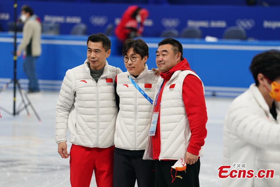 Coach of Chinese short track speed skating team, Kim Sun-tae, poses for a photo with team members at the Capital Indoor Stadium in Beijing , capital of China, Feb. 16, 2022. (Photo: China News Service/Cui Nan)