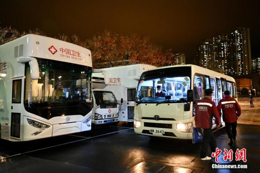 Mobile COVID-19 test vehicles arrive at Hong Kong's Huo-Yan nucleic acid test laboratory at the Ma on Shan Sports Center, Feb. 17, 2022. (Photo: China News Service/Li Zhi Hua)