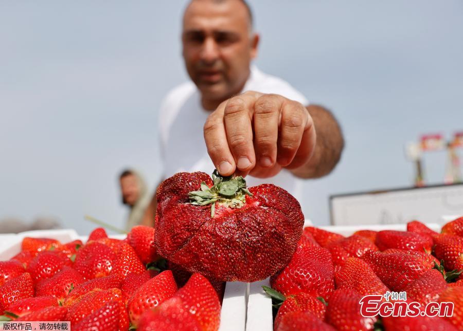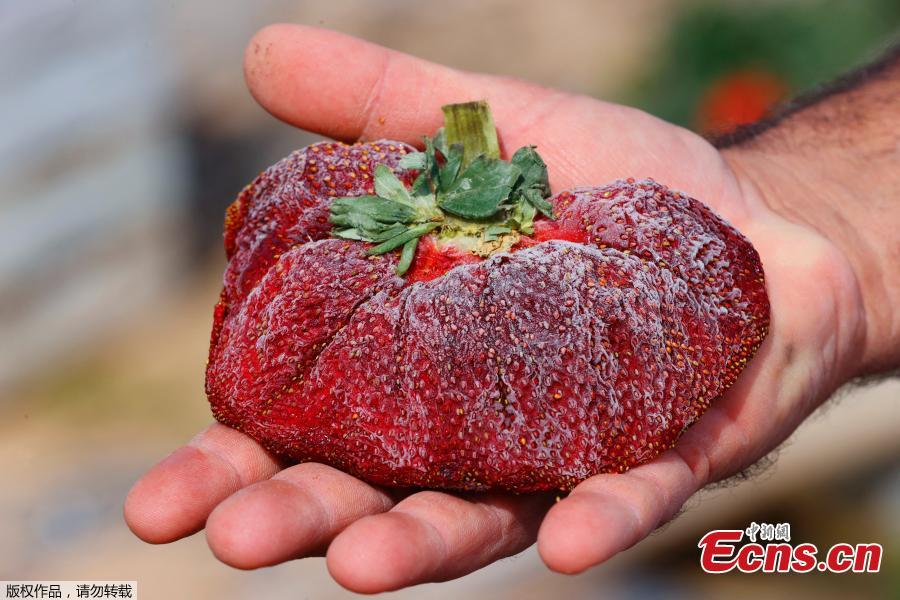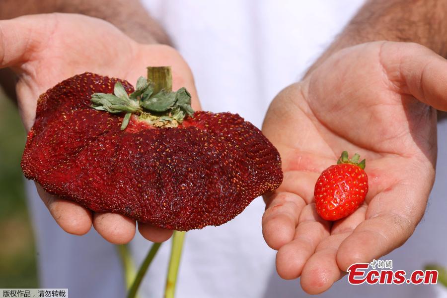 An Israeli farmer displays a 289 gram strawberry which sets a new Guinness World Records for the heaviest, in the Kadima village, Israel, Feb. 17, 2022. (Photo/Agencies)