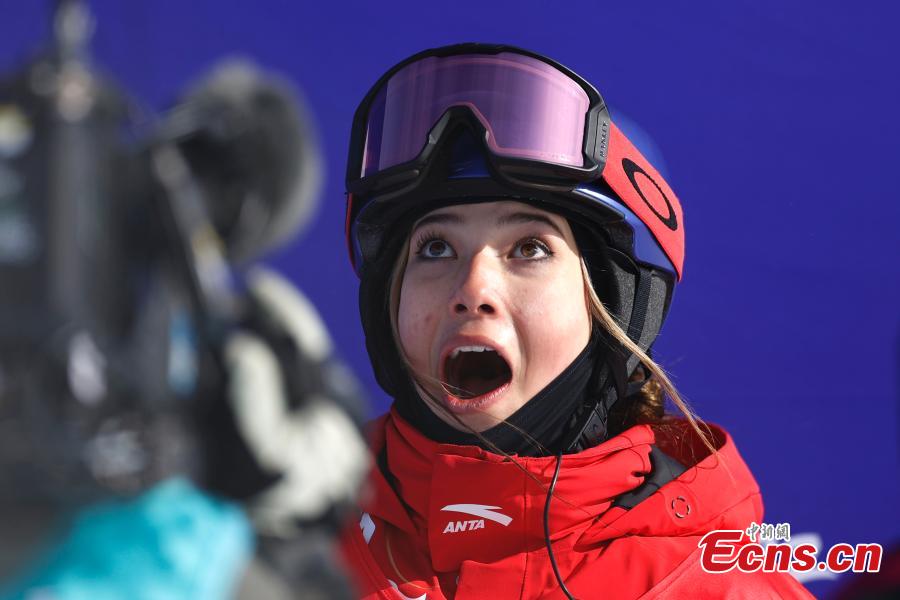 Chinese athlete Gu Ailing reacts during the freestyle skiing women's freeski halfpipe final of Beijing 2022 Winter Olympics at Genting Snow Park in Zhangjiakou, north China's Hebei Province, Feb. 18, 2022. (Photo: China News Service/Fu Tian)