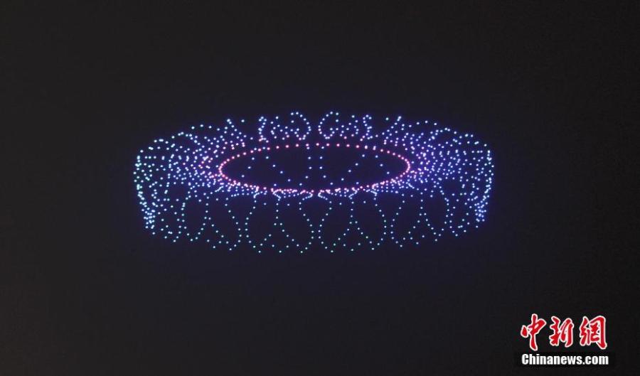 Over 1,000 illuminated drones display the pattern of a torch in the night sky above the West Lake to welcome the 200-day countdown to the 19th Asia Games in Hangzhou, capital city of east China's Zhejiang Province, Feb. 21,2022. (Photo: China News Service/Wang Gang)
