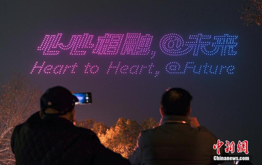 Over 1,000 illuminated drones display a pattern of "Heart to Heart, @Future" in the night sky above the West Lake to welcome the 200-day countdown to the 19th Asia Games in Hangzhou, capital city of east China's Zhejiang Province, Feb. 21,2022. (Photo: China News Service/Wang Gang)