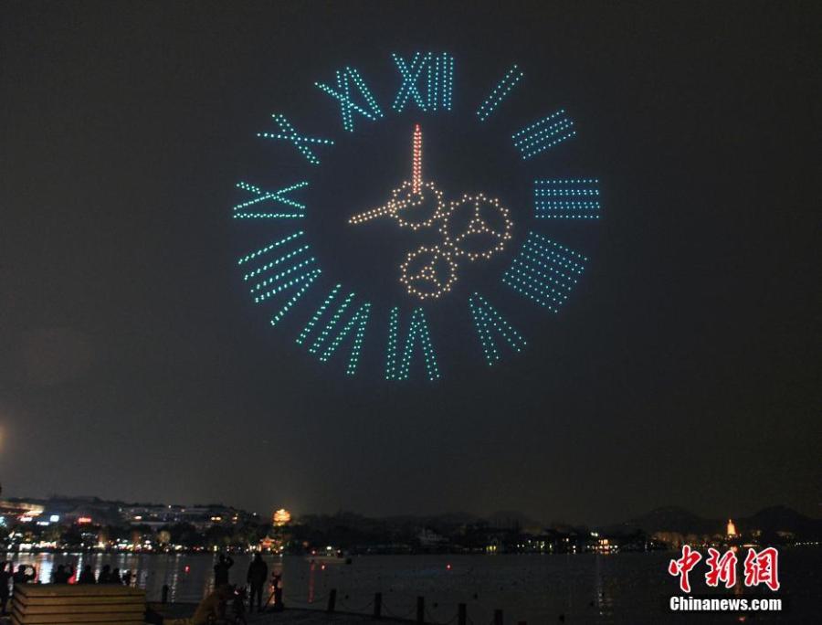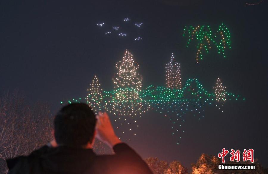 Over 1,000 illuminated drones display the patterns of Leifeng Pagoda and Three Pools Mirroring the Moon, the most renowned scenic spots in the West Lake Scenic Area, in the night sky above the West Lake to welcome the 200-day countdown to the 19th Asia Games in Hangzhou, capital city of east China's Zhejiang Province, Feb. 21,2022. (Photo: China News Service/Wang Gang)
