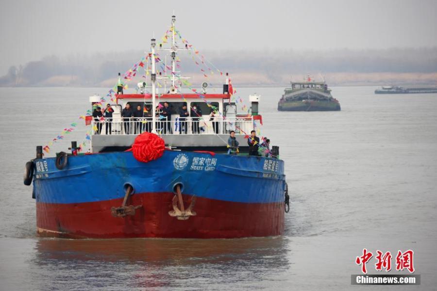 Chuan Lian-1, the electric cargo ship with the largest carrying capacity sailing on the Yangtze River, makes its maiden voyage in Nanjing, east China's Jiangsu Province, Feb. 22, 2022. (Photo: China News Service/Yang Bo)