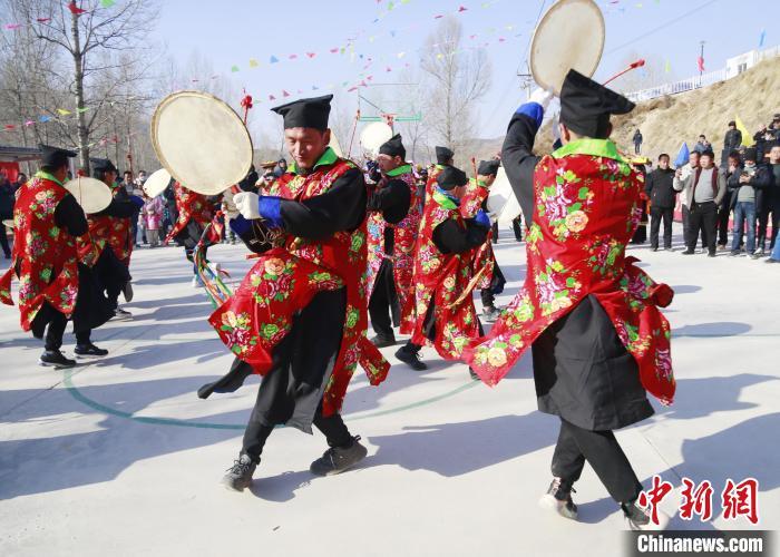 Local dancers perform "Biangbiang Dance", a traditional folk dance of China's Tu ethnic group, in Haidong City, northwest China's Qinghai Province, Feb. 22, 2022. (Photo: China News Servince/Ma Mingyan)