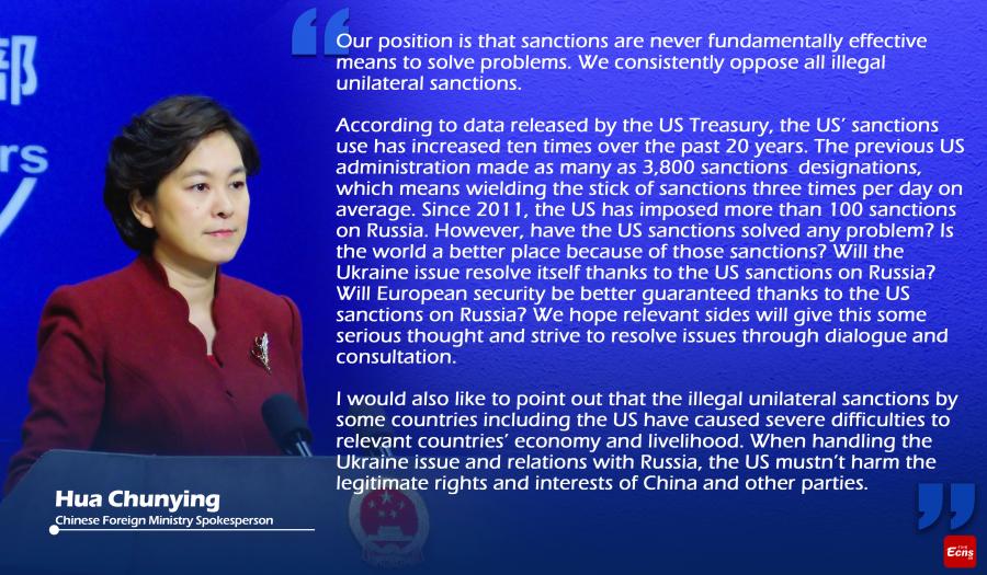 China on Wednesday urged all parties to stay cool-headed and find a solution to the Ukraine issue through negotiations. "Sanctions are never fundamentally effective means to solve problems, and China always opposes all illegal unilateral sanctions," Hua said in response to a query on the recently announced sanctions against Russia for its actions toward Ukraine.