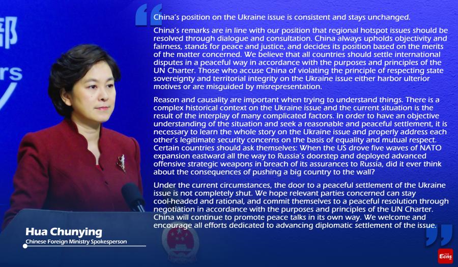China's position on the Ukraine issue is consistent and unchanged, and its stance on the issue is consistent with the long-holding position of promoting dialogue and consultation to resolve regional hotspot issues, Foreign Ministry Spokeswoman Hua Chunying said on Wednesday.