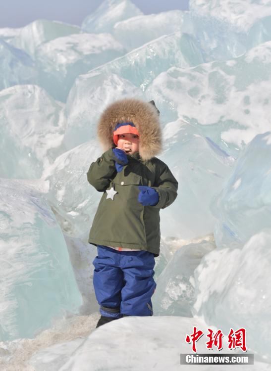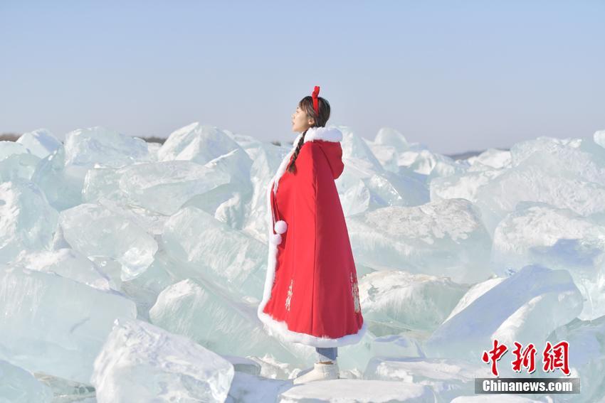 Tourists pose for photos before a pile of blue ice cubes at Jingyuetan National Scenic Area in Changchun City, northeast China's Jilin Province, Feb. 23, 2022. (Photo: China News Service/Zhang Yao)