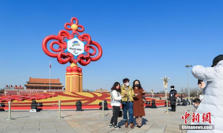 Leaps, the emblem for the Beijing 2022 Paralympic Winter Games, is installed on Tiananmen Square in Beijing, Feb. 24, 2022.(Photo:China News Service/Jia Tianyong)
