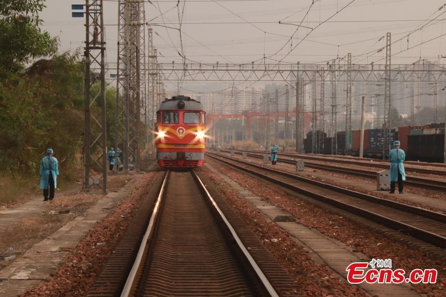 A train returns to Pinghu South National Logistics Hub in Shenzhen after a trial run, March 1, 2022. A special freight train will start operation on Wednesday, March 2, 2022, to stabilize mainland supply of goods to Hong Kong amid the COVID-19 epidemic. (Photo provided to China News Service)