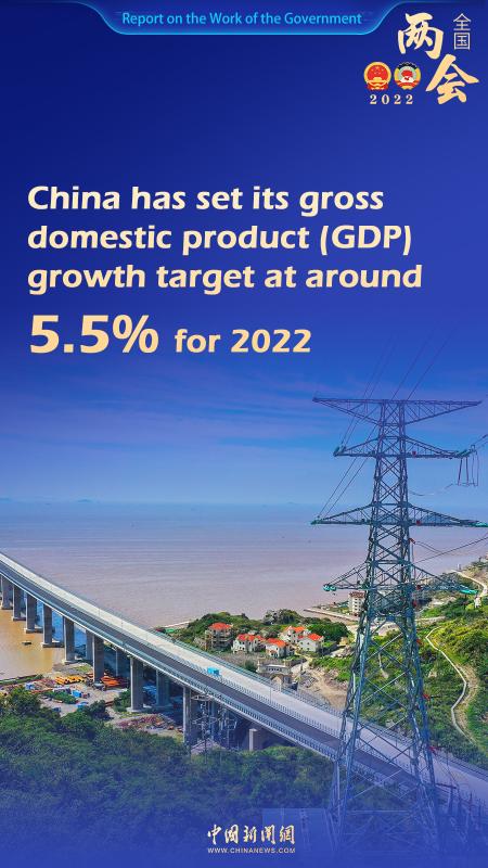 China has set its gross domestic product (GDP) growth target at around 5.5% for 2022, according to a government work report submitted Saturday to the national legislature for deliberation.