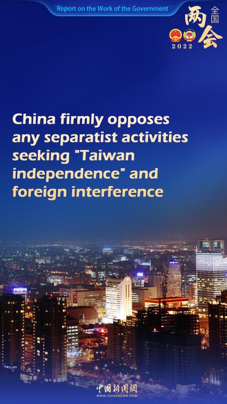 China firmly opposes any separatist activities seeking "Taiwan independence" and foreign interference, according to a government work report submitted Saturday to the national legislature for deliberation.