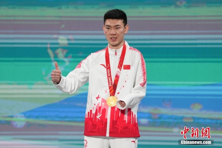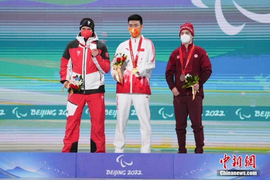 Gold medalist Liang Jingyi of China poses for a photo during the awarding ceremony for the Alpine Skiing Men's Super-G Standing of Beijing 2022 Paralympic Winter Games at Yanqing Medals Plaza of the Winter Paralympics in Yanqing District, Beijing, capital of China, March 6, 2022. (Photo: China News Service/Yang Huafeng)