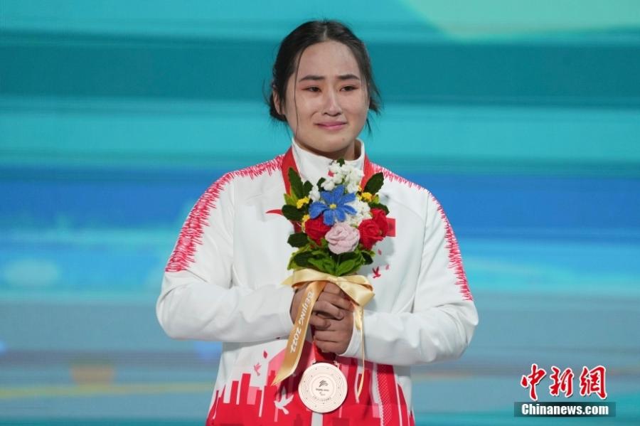 Bronze medalist Zhang Wenjing of China shows her medal during the awarding ceremony for the Alpine Skiing Women's Super-G Sitting of Beijing 2022 Paralympic Winter Games at Yanqing Medals Plaza of the Winter Paralympics in Yanqing District, Beijing, capital of China, March 6, 2022. (Photo: China News Service/Yang Huafeng)