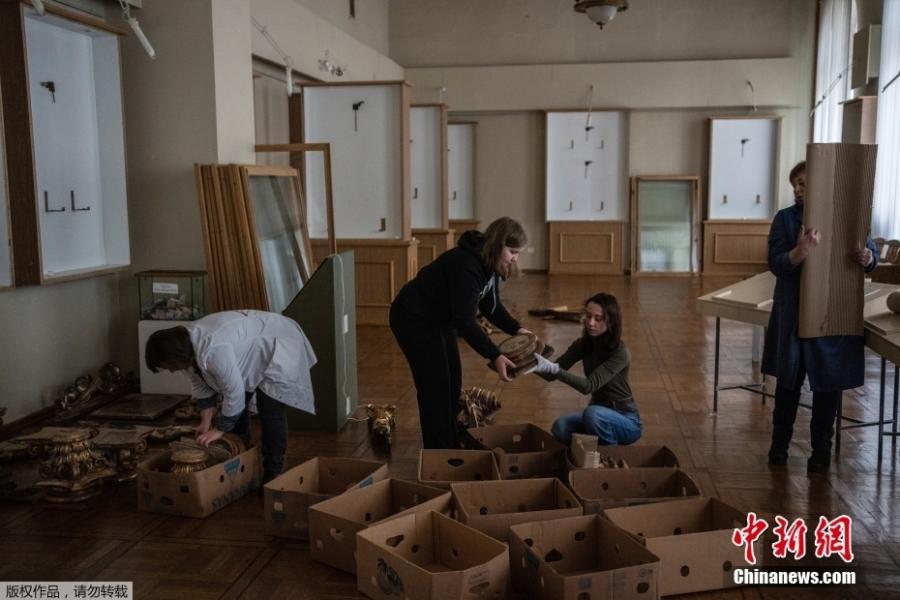 Workers and volunteers of the Andrey Sheptytsky National Museum store Baroque pieces in cardboard boxes as safety preparations in Lviv, Ukraine, March 6, 2022. (Photo/Agencies)