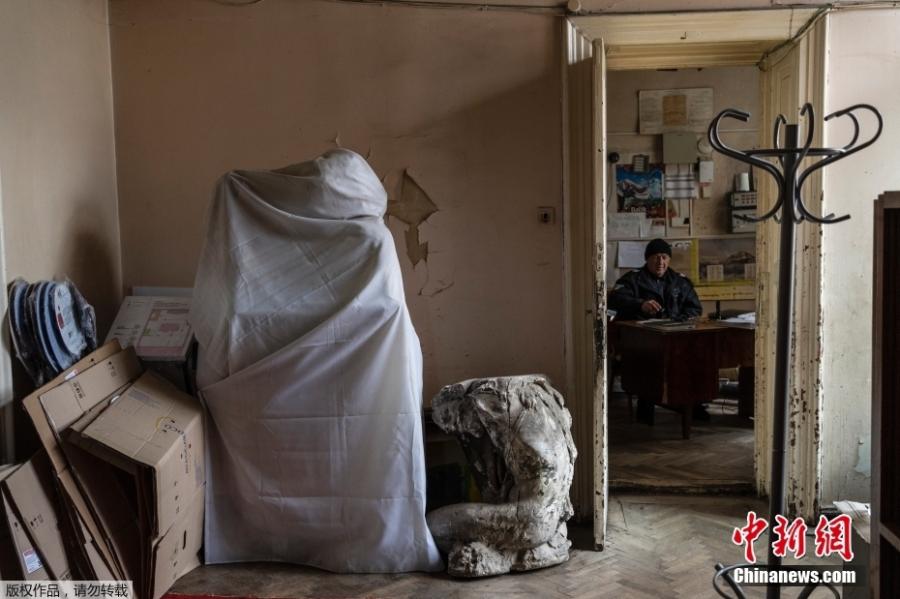 A sheet covers a sculpture of the Andrey Sheptytsky National Museum in Lviv, Ukraine, March 6, 2022. (Photo/Agencies)