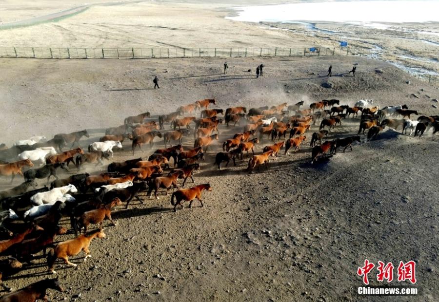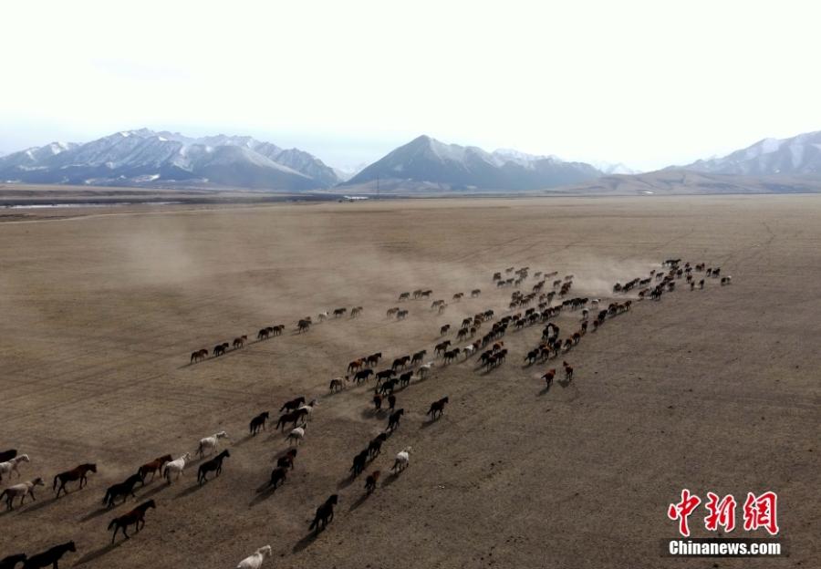 Horses forage at the Shandan horse ranch at the foot of the Qilian Mountains in Northwest China's Gansu Province, March 5, 2022. Shandan horse ranch, located in Shandan County of Zhangye City, northwest China's Gansu Province, was built in the Western Han Dynasty (202 BC-AD 25). (Photo provided to China News Service)