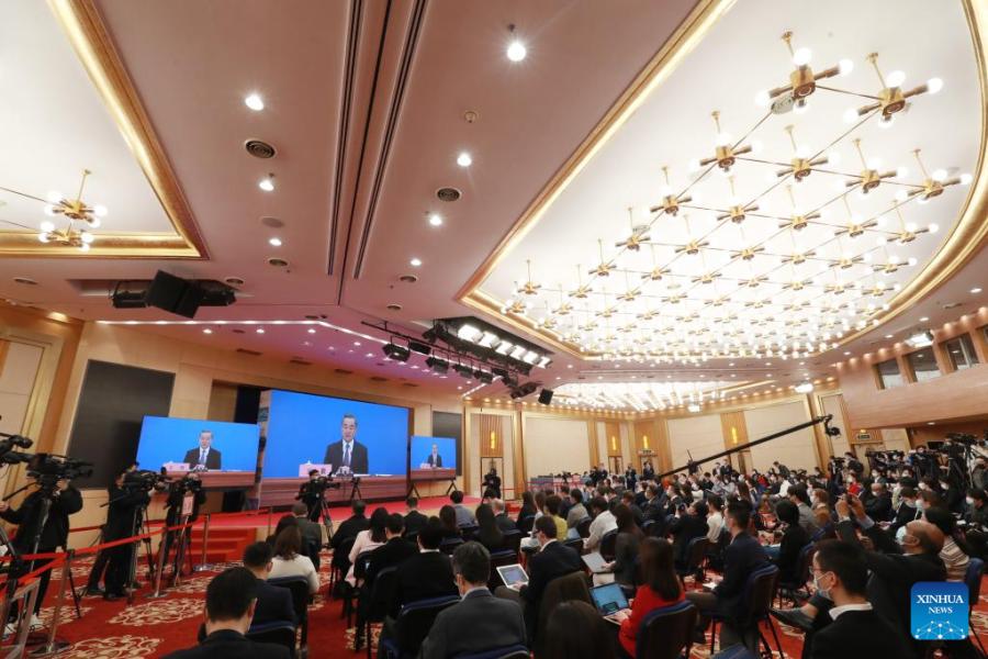 Chinese State Councilor and Foreign Minister Wang Yi attends a press conference on China's foreign policy and foreign relations via video link on the sidelines of the fifth session of the 13th National People's Congress (NPC) at the Great Hall of the People in Beijing, capital of China, March 7, 2022. (Xinhua/Yin Gang)