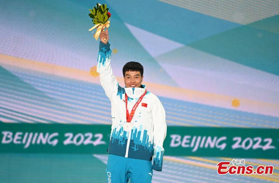 Silver medalist Wang Yaopeng poses for photos during the awarding ceremony for Para Snowboard Men's Snowboard Cross SB-UL event of Beijing 2022 Paralympic Winter Games at Zhangjiakou Medals Plaza in Zhangjiakou, north China's Hebei Province, March 7, 2022. (Photo: China News Service/Han Bing)