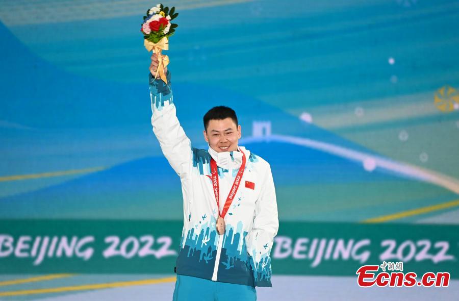Bronze medalist Zhu Yonggang poses for photos during the awarding ceremony for Para Snowboard Men's Snowboard Cross SB-UL event of Beijing 2022 Paralympic Winter Games at Zhangjiakou Medals Plaza in Zhangjiakou, north China's Hebei Province, March 7, 2022. (Photo: China News Service/Han Bing)