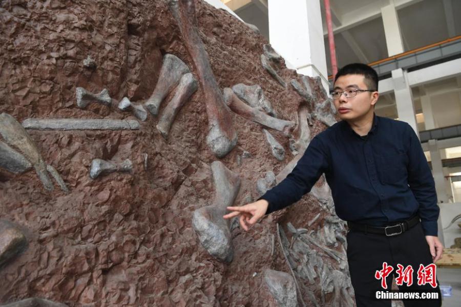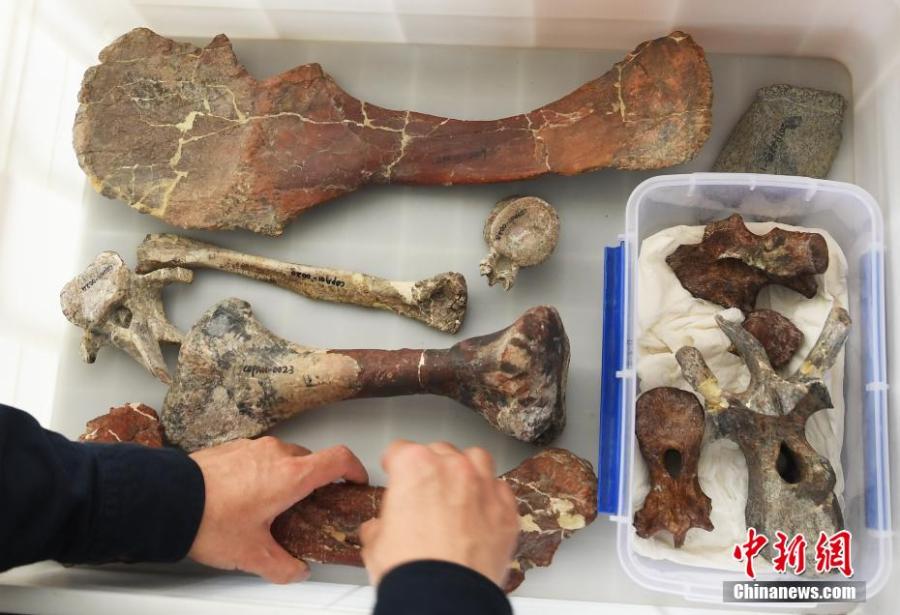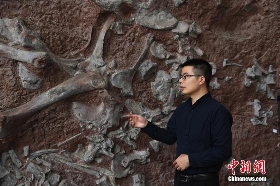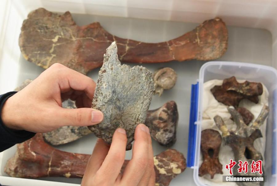 A staff member shows the dinosaur fossil remains found in Yunyang County, southwest China's Chongqing, March 10, 2022. (Photo: China News Service/Chen Chao)