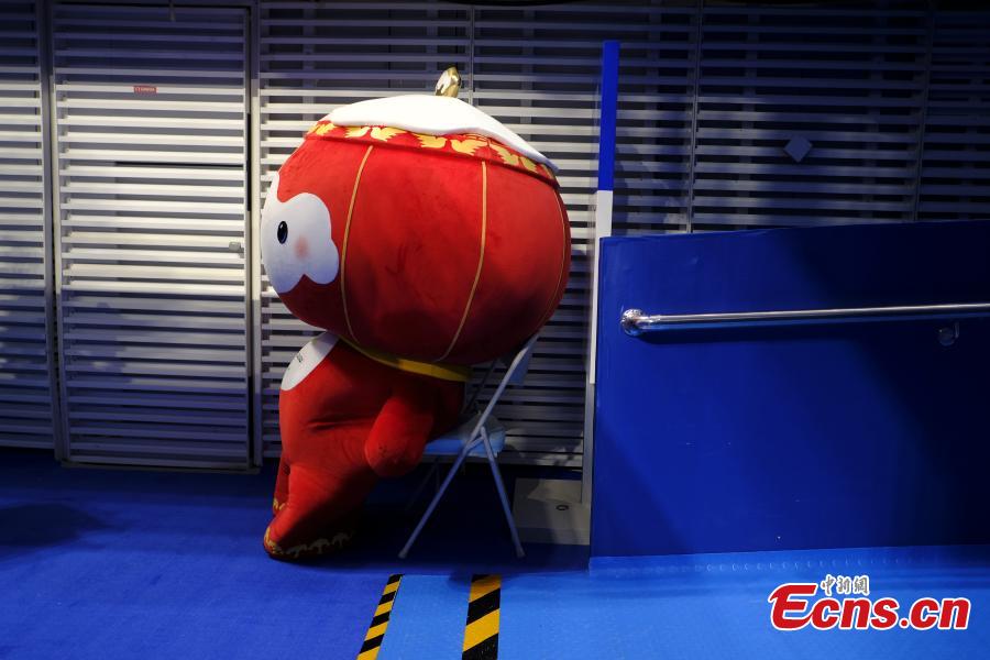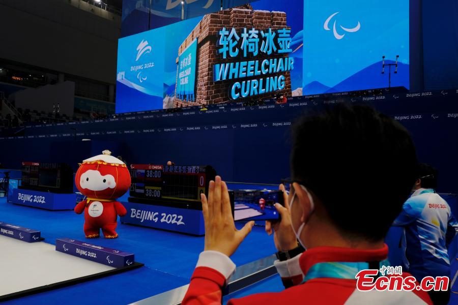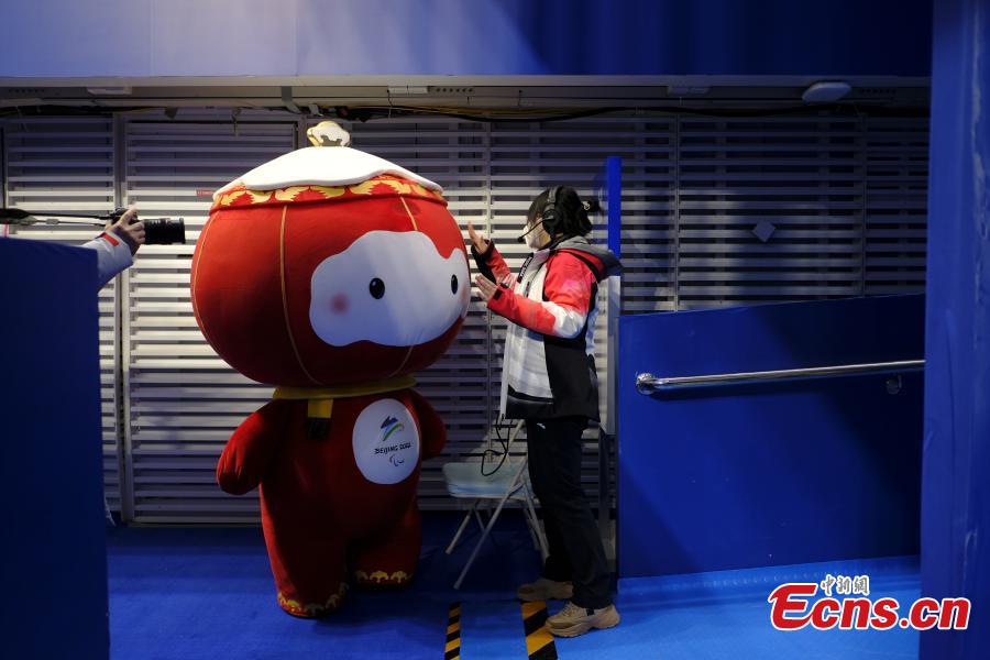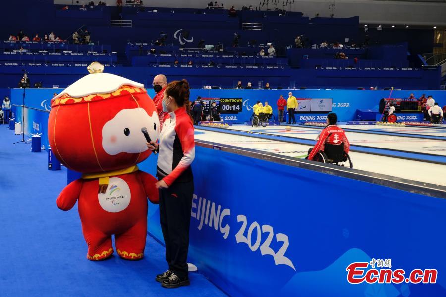 Shuey Rhon Rhon, the red lantern-shaped mascot of Beijing 2022 Winter Paralympic Games, appears at the National Aquatics Center, also known as the "Ice Cube", venue of wheelchair curling competition of the Games in Beijing, March 10, 2022. (Photo: China News Service/Han Haidan)