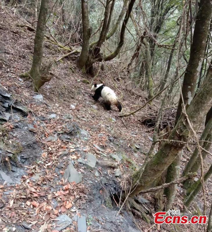 Photo taken on March 13, 2022 shows a giant panda wandering in the woods at a National Nature Reserve in Baoxing county, southwest China's Sichuan Province. Two forest rangers spotted the panda drinking water and playing on the mountain. (Photo provided to China News Service)