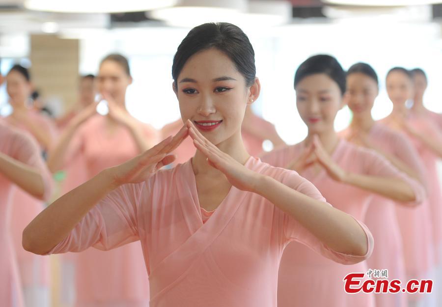 Photo shows flight attendants of Zhejiang Loong Airlines undergoing rigorous posture training, March 14, 2022. A total of 300 flight attendants received an etiquette training, including 13 courses for Hangzhou 2022 Asian Games, which will be held from Sept. 10 to 25, 2022 in Hangzhou, Zhejiang Province. (Photo: China News Service/Wang Gang)