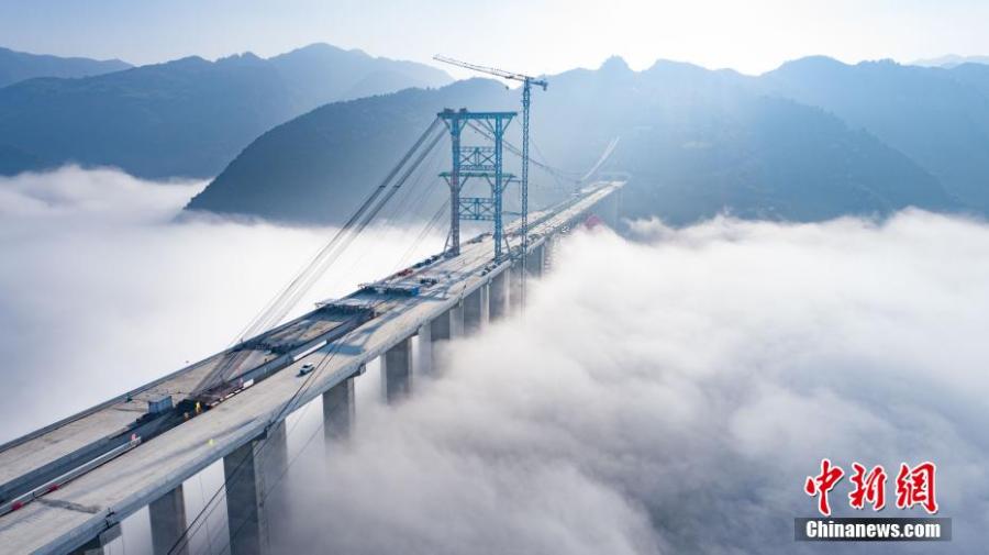 Photo taken on March 15, 2022 shows clouds surrounded Dafaqu grand bridge of Renhuai-Zunyi expressway in southwest China's Guizhou Province. The bridge, with designed length of 1,427 meters and width of 33 meters, is one of the key projects along the expressway. (Photo: China News Service/He Xiaobo)