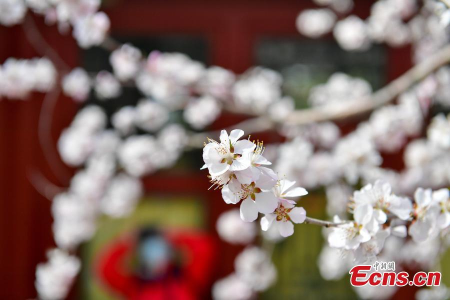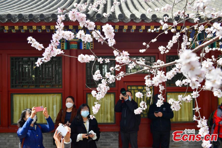 Photo shows blooming peach flowers at Beihai Park in Beijing, capital of China, March 15, 2022. (Photo:China News Service/Tian Yuhao)