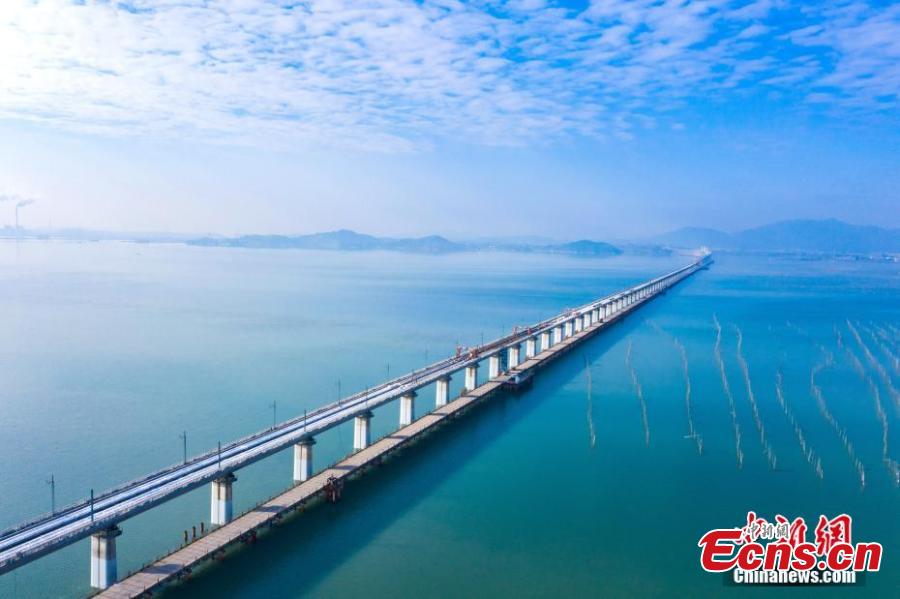 Photo taken on March 17, 2022 shows the cross-sea high-speed railway bridge linking Fuzhou with Xiamen in Fujian Province. (Photo: China News Service/He Weidong)