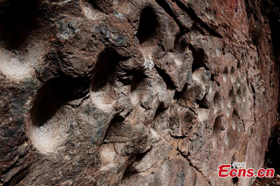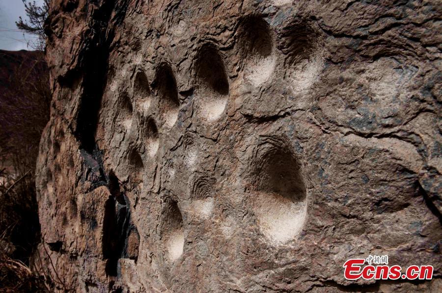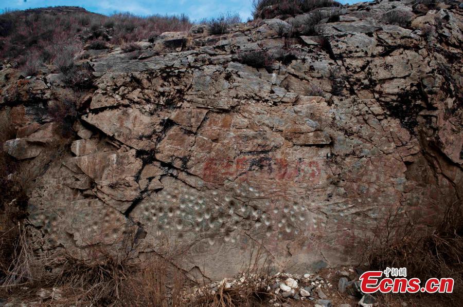 Photo shows the rock paintings carved on the surface of caves, the largest discovery, have been found in Tongtian River base, Tibetan Autonomous Prefecture of Yushu, northwest China's Qinghai Province, March 14, 2022. (Photo provided to China News Service)