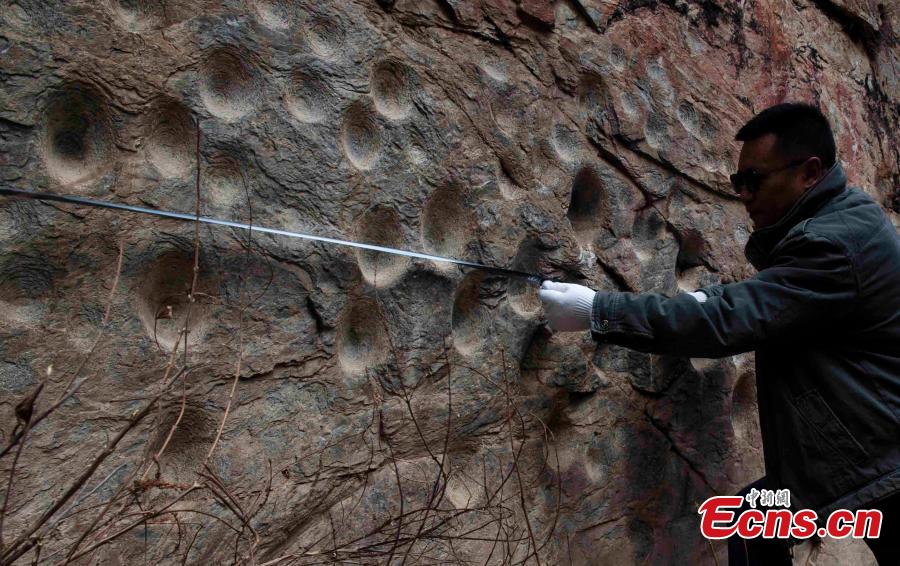 A researcher measures the cave paintings in Tibetan Autonomous Prefecture of Yushu, northwest China's Qinghai Province, March 14, 2022. (Photo provided to China News Service)