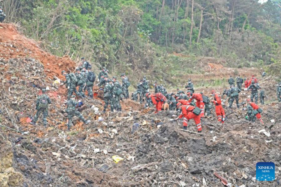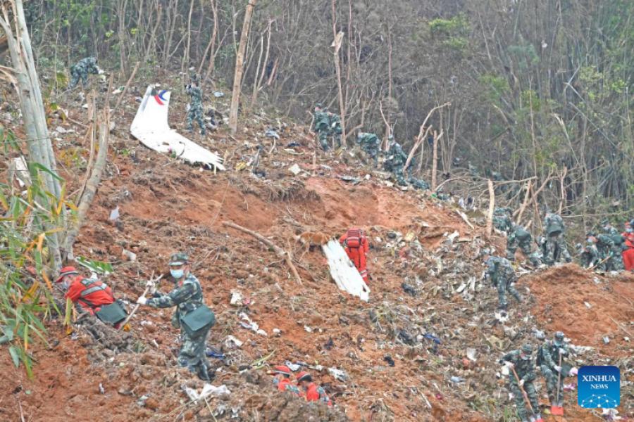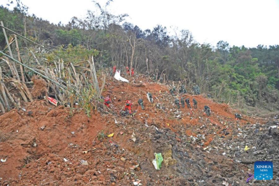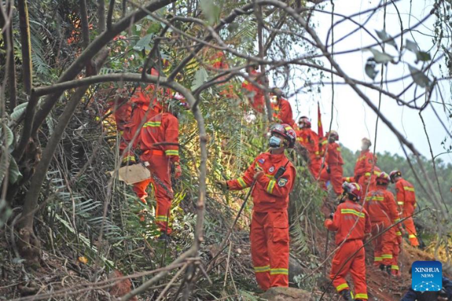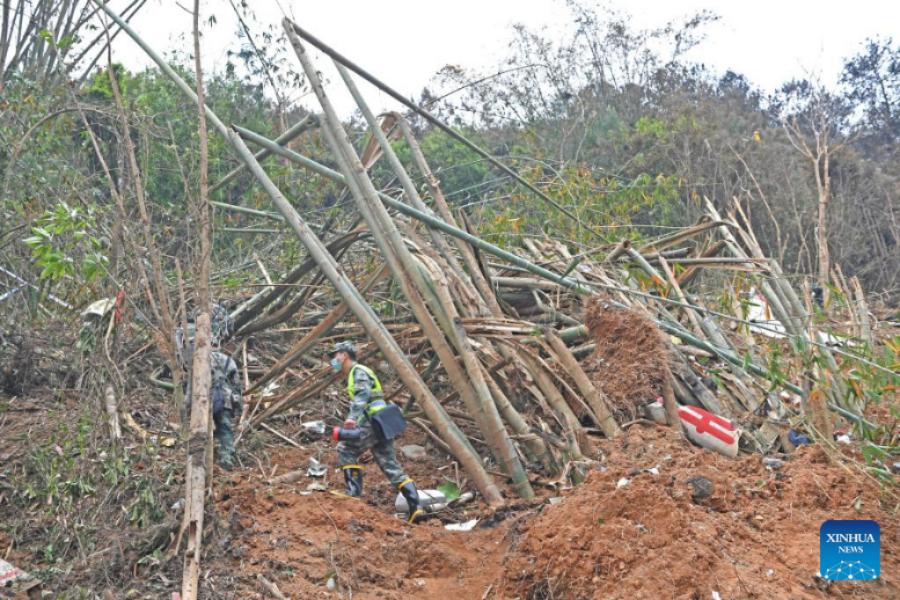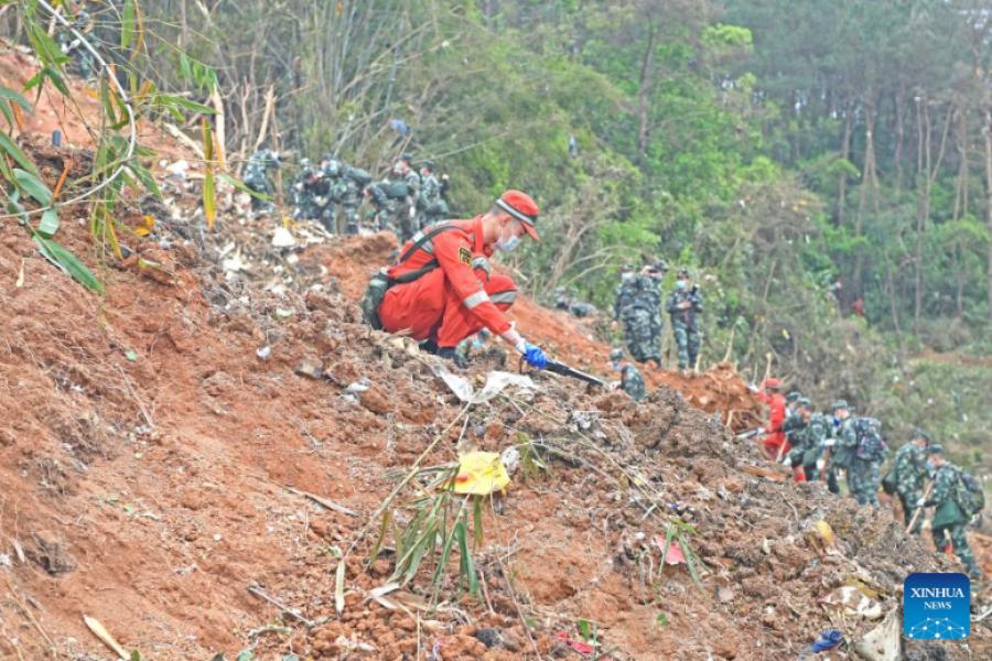 Rescuers search for the black boxes at a plane crash site in Tengxian County, south China's Guangxi Zhuang Autonomous Region, March 22, 2022. Rescuers are making all-out efforts to retrieve the black boxes of a passenger plane that crashed in south China's Guangxi Zhuang Autonomous Region Monday afternoon, an official with the Civil Aviation Administration of China (CAAC) said Tuesday night. (Xinhua/Zhou Hua)