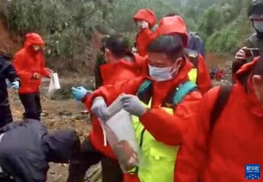 This image captured from video footage shows a black box of the crashed plane is recovered, south China's Guangxi Zhuang Autonomous Region, March 23, 2022. (Xinhua)