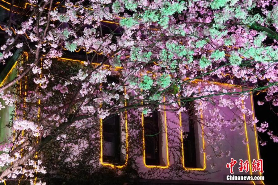 Night scenery of cherry blossoms at the Yuantouzhu (Turtle Head Isle) scenic spot in Wuxi, Jiangsu Province, March 23, 2022. The special beauty of cherry blossoms draws many viewers each year. (Photo: China News Service/Sun Quan)