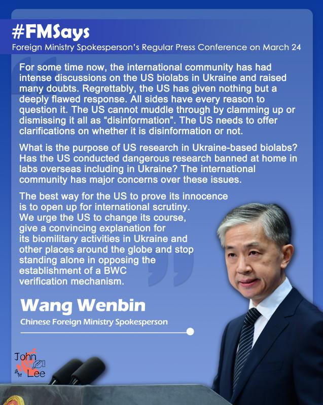 The United States should give a convincing account of its biological military activities in Ukraine and around the world as soon as possible, a Chinese foreign ministry spokesperson said on Thursday.