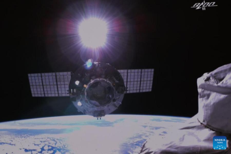 Screen image taken at Beijing Aerospace Control Center on March 27, 2022 shows the Shenzhou-13 astronauts watching the Tianzhou-2 cargo spacecraft leaving the core module of China's Tiangong space station. (Xinhua/Guo Zhongzheng)