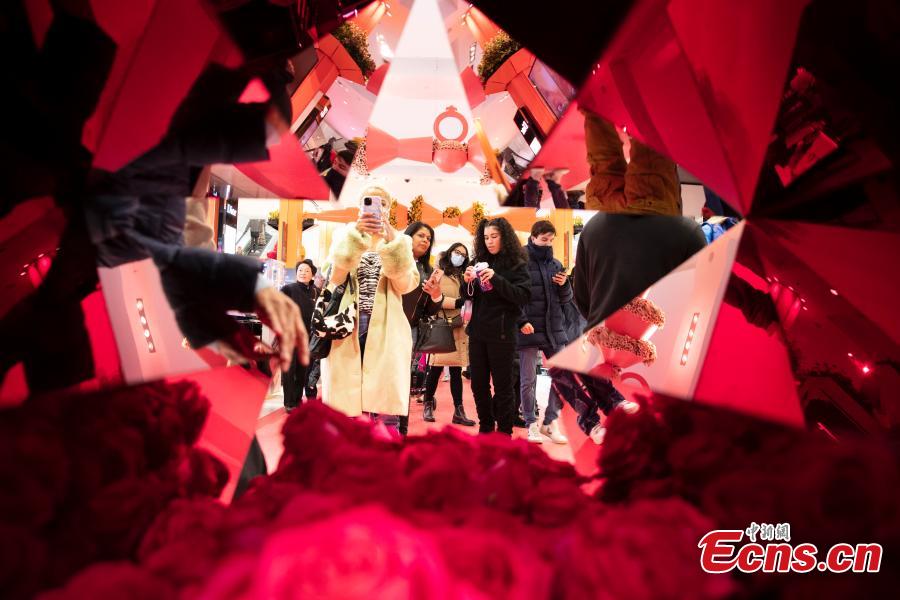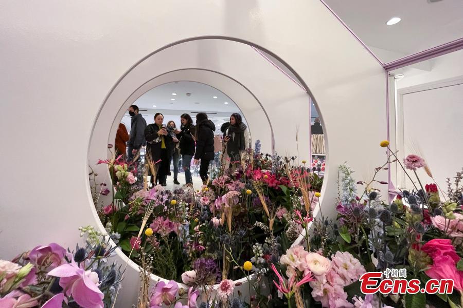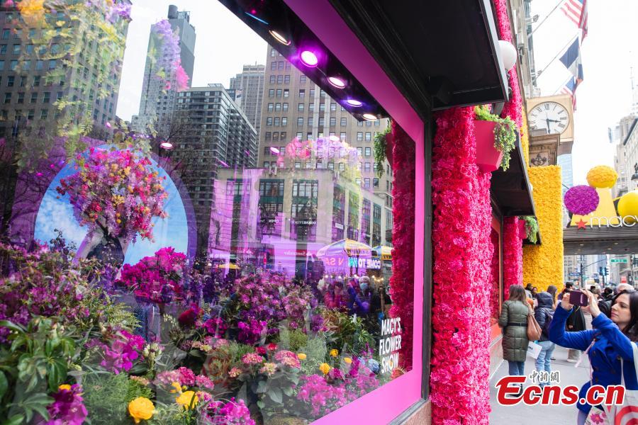 A flower installation is seen at Macy's Herald Square flagship store in New York, the United States, March 27, 2022. (Photo: China News Service/Liao Pan)