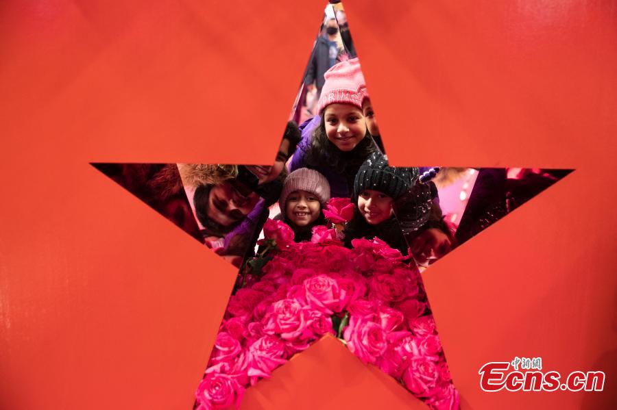 Kids visit Macy's Flower Show at Macy's Herald Square flagship store in New York, the United States, March 27, 2022. The annual flower show will be held from March 27 to April 10 this year. (Photo: China News Service/Liao Pan)