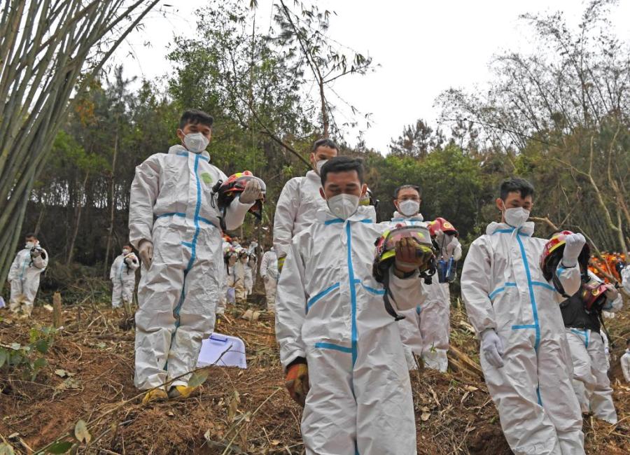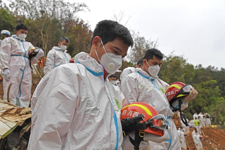 Photo taken on March 27, 2022 shows a memorial event at the crash site of the China Eastern Airlines plane to mourn the deaths of the 132 people involved in the accident in Tengxian County, south China's Guangxi Zhuang Autonomous Region. At about 2 p.m., as the sound of horns blared throughout a mountainous area in Tengxian County, all staff members of the national emergency response headquarters for the accident and rescuers at the site stood solemnly in silence for three minutes in a tribute to the victims. (Xinhua/Huang Xiaobang)