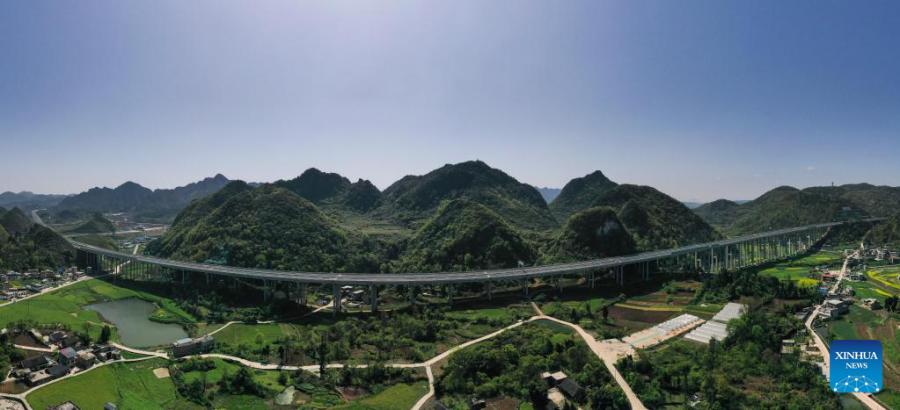 Aerial photo taken on March 28, 2022 shows the Xinminjing grand bridge along Guiyang-Huangping Highway in southwest China's Guizhou Province. The construction of the main line of Guiyang-Huangping Highway has entered the final stage and is expected to be completed within this year. The main line of this highway stretches 120.6 kilometers and will connect Guizhou with the Yangtze River Delta region. (Xinhua/Yang Wenbin)