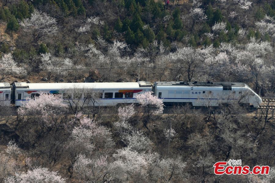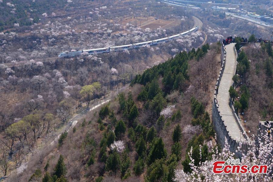 A train runs through a sea of flower blossoms near Juyongguan Pass at the Great Wall, Beijing, March 28, 2022. Line S2 is praised as the train to spring, as it passes a field of blossoming flowers in spring. (Photo/VCG)